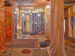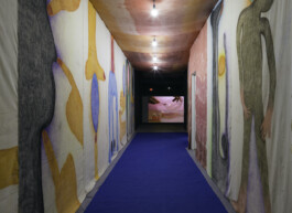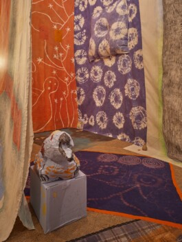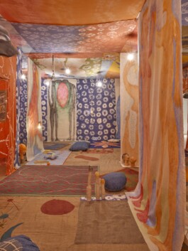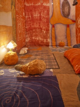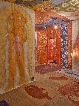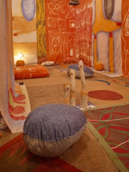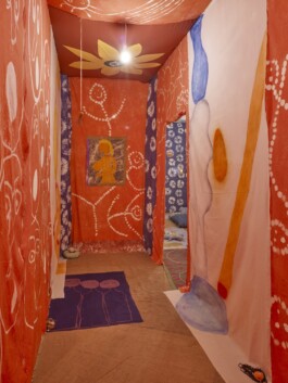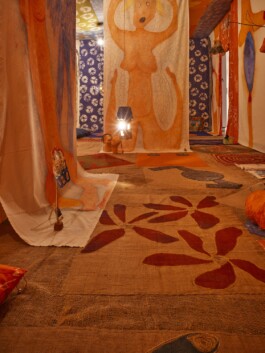 A passageway lures visitors into a labyrinthine space lined with pulsating bleached drawings on red fabric, which opens onto a central area where colorful monumental figures and floor sculptures portray fluid life-affirming rituals and rites of community. Were it possible to see the gallery from above, visitors would realize that they are traveling through a space shaped after the kidney—one of the organs through which the body metabolizes the world, fabricating sustaining energy and discarding what threatens it. Eceiza’s installation also references temporary architectures—improvised shelter, space of childhood imagination and play, and ephemeral site of communal ritual practice—reassigning the positions of host and guest to welcome an array of possible hospitable/hostile relationships.