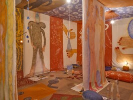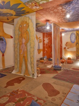 Introduced by a slightly oversized soft sculpture of a body in parts leaning in a corner, colorful monumental figures partaking in fluid life-affirming rituals grace a long blue-floored passageway, buoying visitors into a transformative voyage. These large chalk drawings lead to a smaller room where contortionists and muses both neutralize time and open onto a wide space of rebirth where visitors can rest on a few more soft body-parts sculptures as they contemplate a portrait gallery of expanded kinship. Eceiza’s installation also references temporary architectures—improvised shelter, space of childhood imagination and play, and ephemeral site of communal ritual practice—reassigning the positions of host and guest to create a space for an array of possible hospitable/hostile relationships.