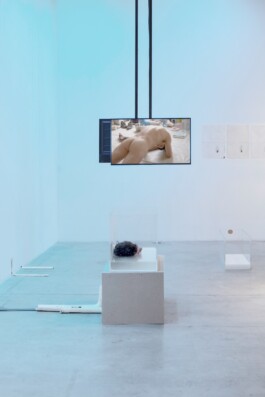 Jean-Charles de Quillacq presents an archipelago of recent and reconfigured works, including a video of the artist at work playing synchronically on two back-to-back monitors suspended from the ceiling, and a new site-responsive sculpture (Armpit) incorporating one of the galleries’ distinctive columns. Coated with a thick layer of amber petroleum jelly discretely spattered with axilla hair—harvested by the artist from a local donor recruited on Tinder—the column is given a skin. De Quillacq’s gesture thus mobilizes this structural feature of the exhibition space, drawing attention to one of its “bones” and to the relationships between bodies and architecture.