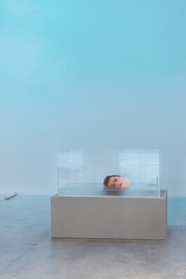 Superclogger, 2021. Plexi aquarium, water pump, artificial sweat, silicone mask, and hair, 20 x 40 x 16 inches. Courtesy of the artist and Marcelle Alix, Paris. Image courtesy of Bemis Center for Contemporary Arts; photo: Colin Conces.